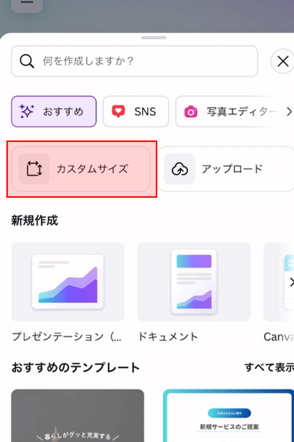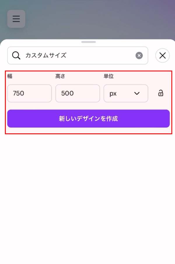 4.「750」「500」「px」を入力「新しデザインを作成」を押下